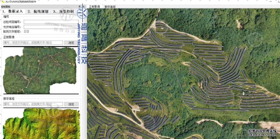 在三維建模的基礎上,珈鷹科技進一步提取高程數據,生成DEM(數字高程模型)。該模型能夠清晰展示光伏電站的地形起伏和光伏板的相對高度,為巡檢飛行提供重要的地形參考。同時,通過專業的影像處理技術,對三維模型中的影像數據進行糾正和拼接,生成DOM(正射影像圖)。DOM圖能夠真實反映光伏電站的地理位置與形狀,為精細化巡檢提供精準的地圖支持。