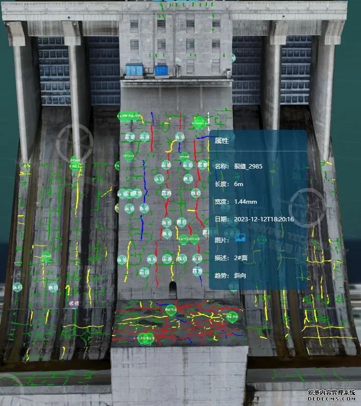 珈鷹也能實現(xiàn)對大壩主體結構破損、裂縫等病害的智能檢測。借助深度學習、機器視覺等先進算法,該系統(tǒng)能夠智能識別與測量裂縫等缺陷,并將其大小及位置直觀展示在重建的三維模型上,實現(xiàn)檢測結果的可視化。